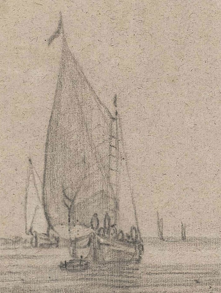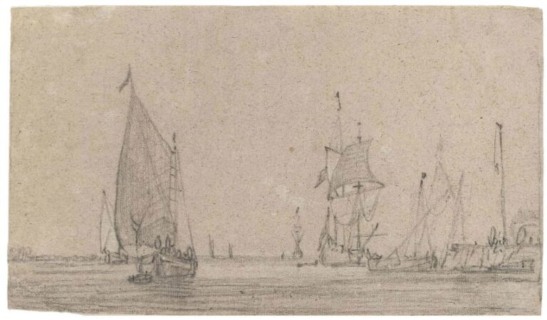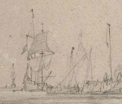 The present drawing is a good example of De Vlieger’s rare marine drawings.2 The swift and assured touch creates the impression that the scene was drawn from life.
