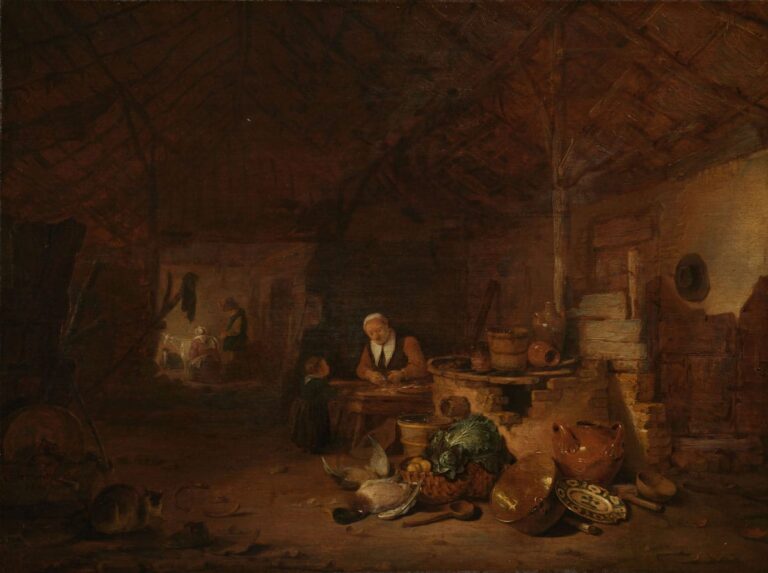 Egbert van der Poel was taught by Cornelis Saftleven in Rotterdam, but spent most of his working life in Delft.5 He painted landscapes, beach views and stable interiors, but is best known for his many depictions of the so-called thunderclap, the explosion of the gunpowder magazine in Delft on 12th October 1654, which killed many of his fellow townsmen, including Carel Fabritius. The original painting of the stable interior that Van der Vinne so meticulously copied is no longer known today, but a comparable example is preserved in the Rijksmuseum in Amsterdam, dating from 1646, well before the gunpowder explosion (fig.).6 The lost painting recorded in this ‘natekening’ is likely to have dated from the same period.