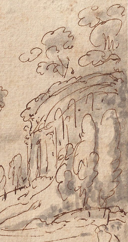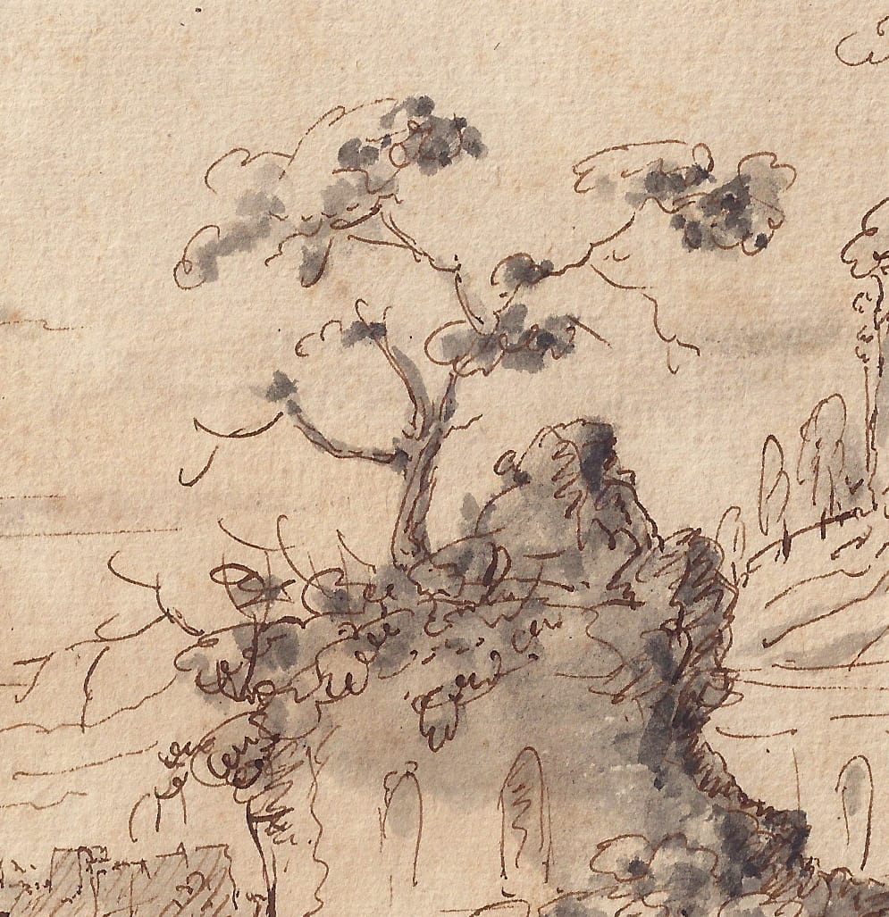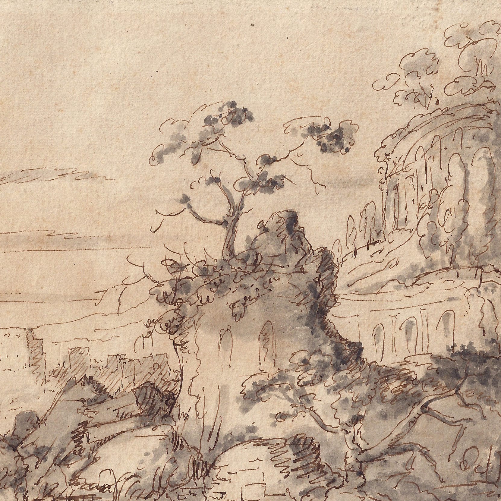 Pen and brown ink and grey wash on paper, black ink framing lines, 147 x 200 mm (5.8 x 7.9 inch), laid down into 18th- or 19th-century thick paper